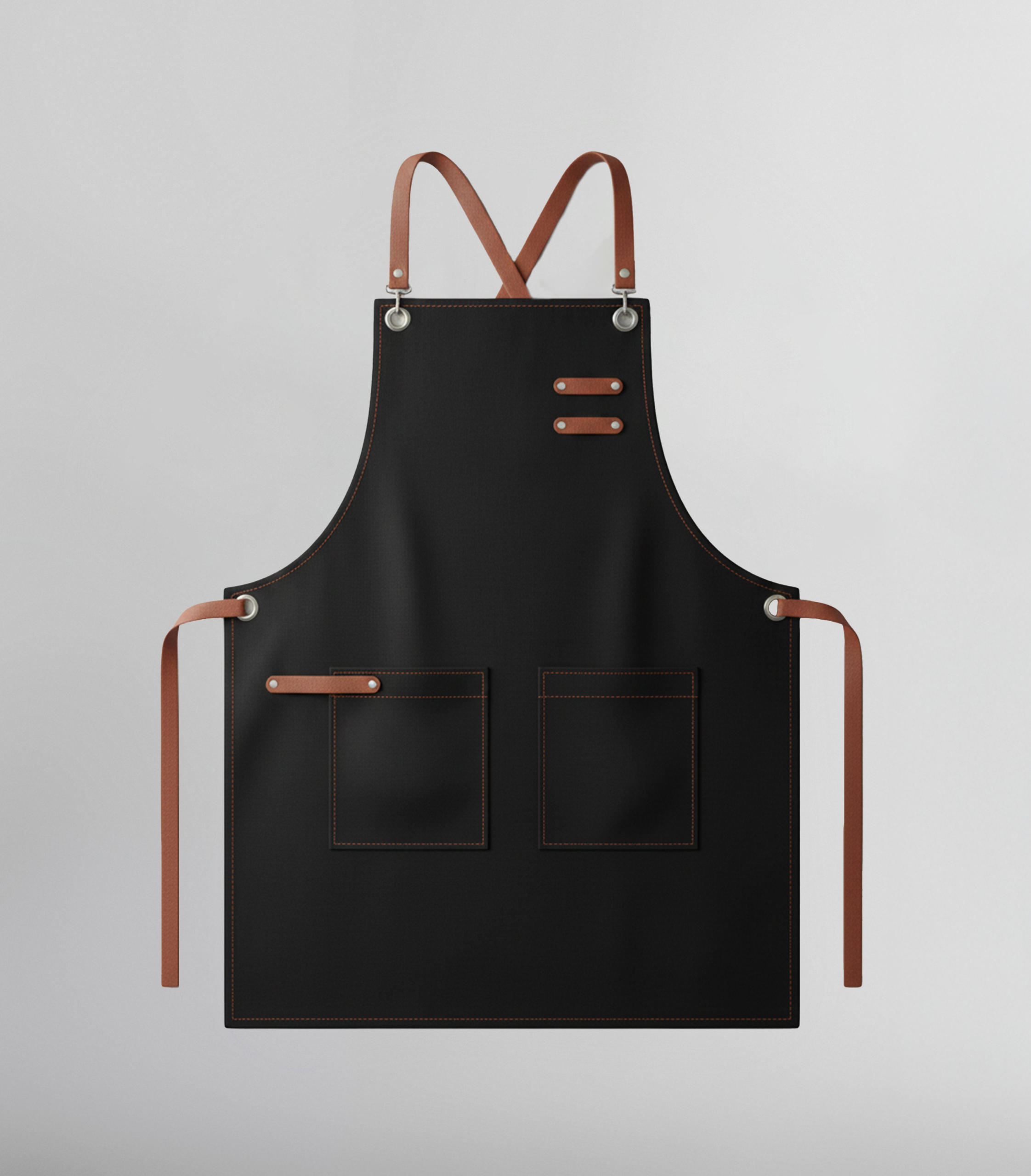 Delantal negro de diseño clásico con ribetes claros que realzan su estructura. Perfecto para restaurantes, cafeterías o marcas que buscan una imagen profesional y uniforme.
